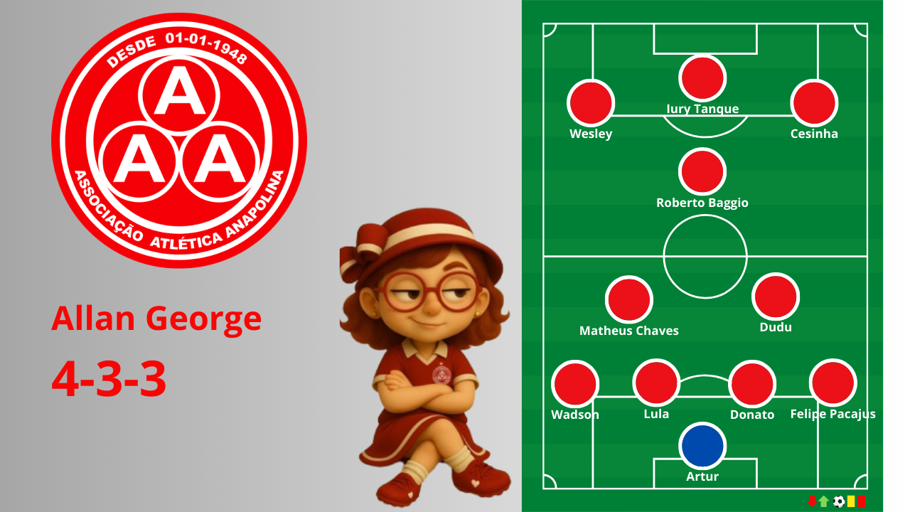 O técnico Allan George não tem desfalques para este jogo. Com isto, a tendência é que ele repita a equipe que iniciou o jogo contra a Jataiense.